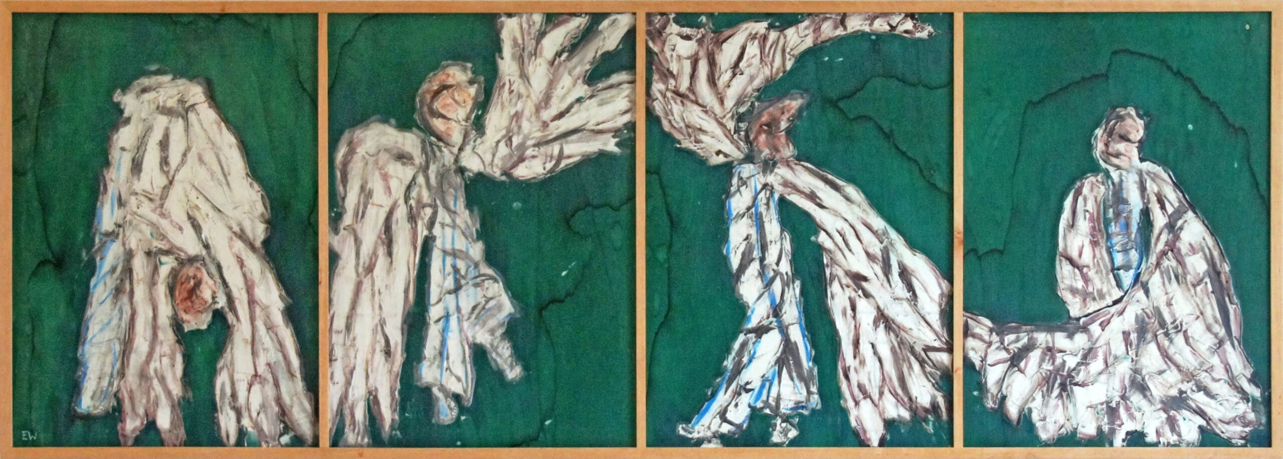 Es geht auch um Träume und Märchen, um Erzählungen und um andere Welten aus Popkultur und Kinderbüchern, um Gott und die Engel (die möglicherweise auch in Weisers Vision Energie sind). Gleichzeitig geht es um das Hier und Jetzt, um Motive und - wie so oft in seiner Arbeit - um Materialien aus dem Alltag, die in den geschichteten Oberflächen der Bilder eingebunden sind. Auch die lauten, ja sogar grellen Farben haben mehr gemeinsam mit Baustellen, Schulhöfen und Werkstätten als mit der erhabenen Welt der Akademie der bildenden Künste.